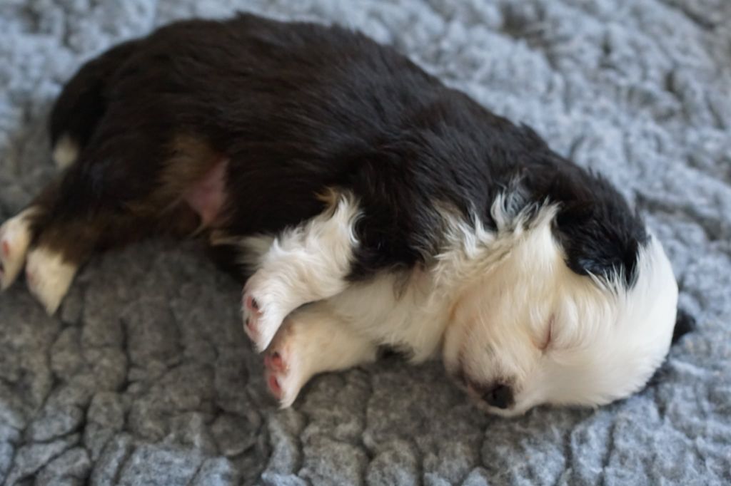 Chiot noir tricolore aux yeux vairons, 1 oeil bleu et 1 oeil marron